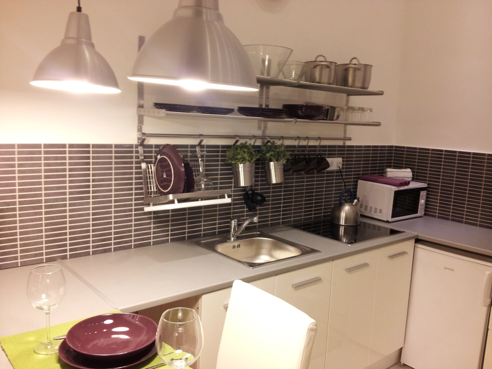 szekrénysor, mosogató, tűzhely, étkészlet, poharak, bögrék, evőeszközök, edények, hűtő, mikrohullámú sütő