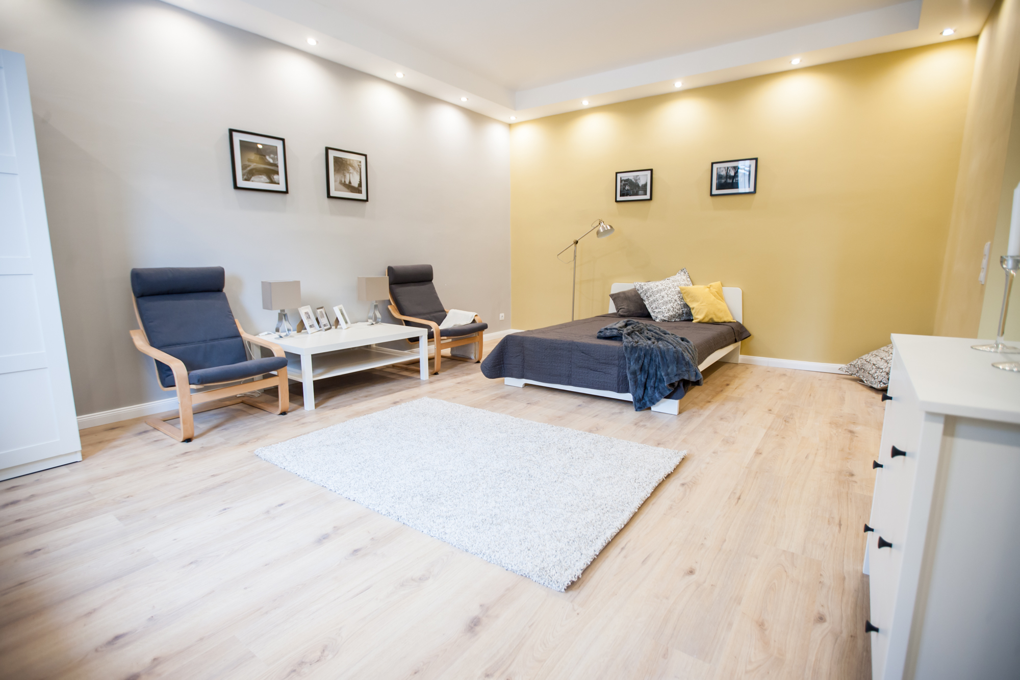 dupla ágy, éjjeli szekrény, dohányzó asztal, íróasztal, polcok, szekrény