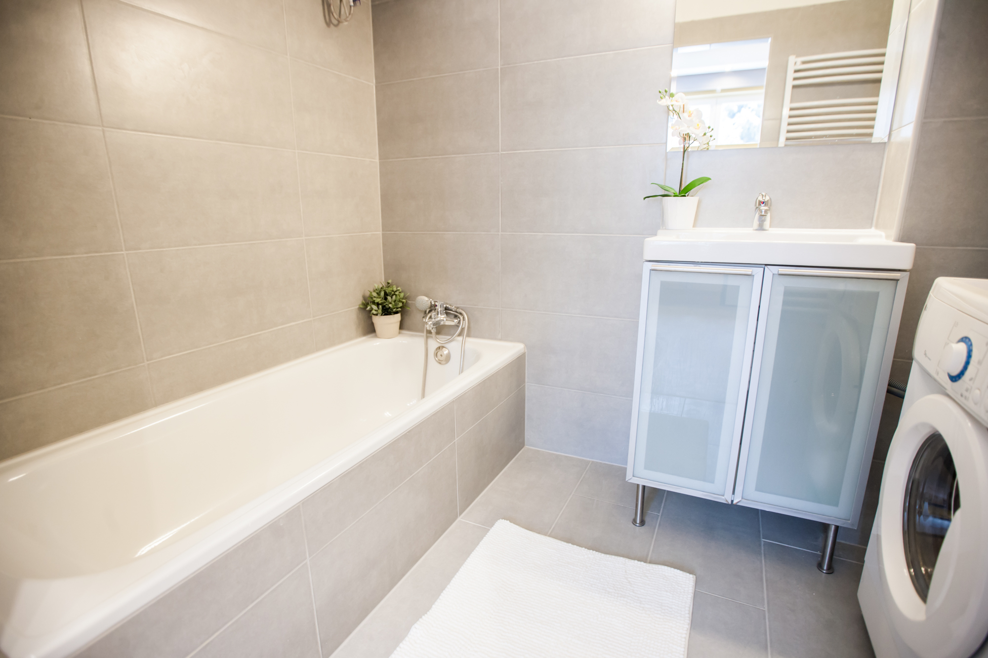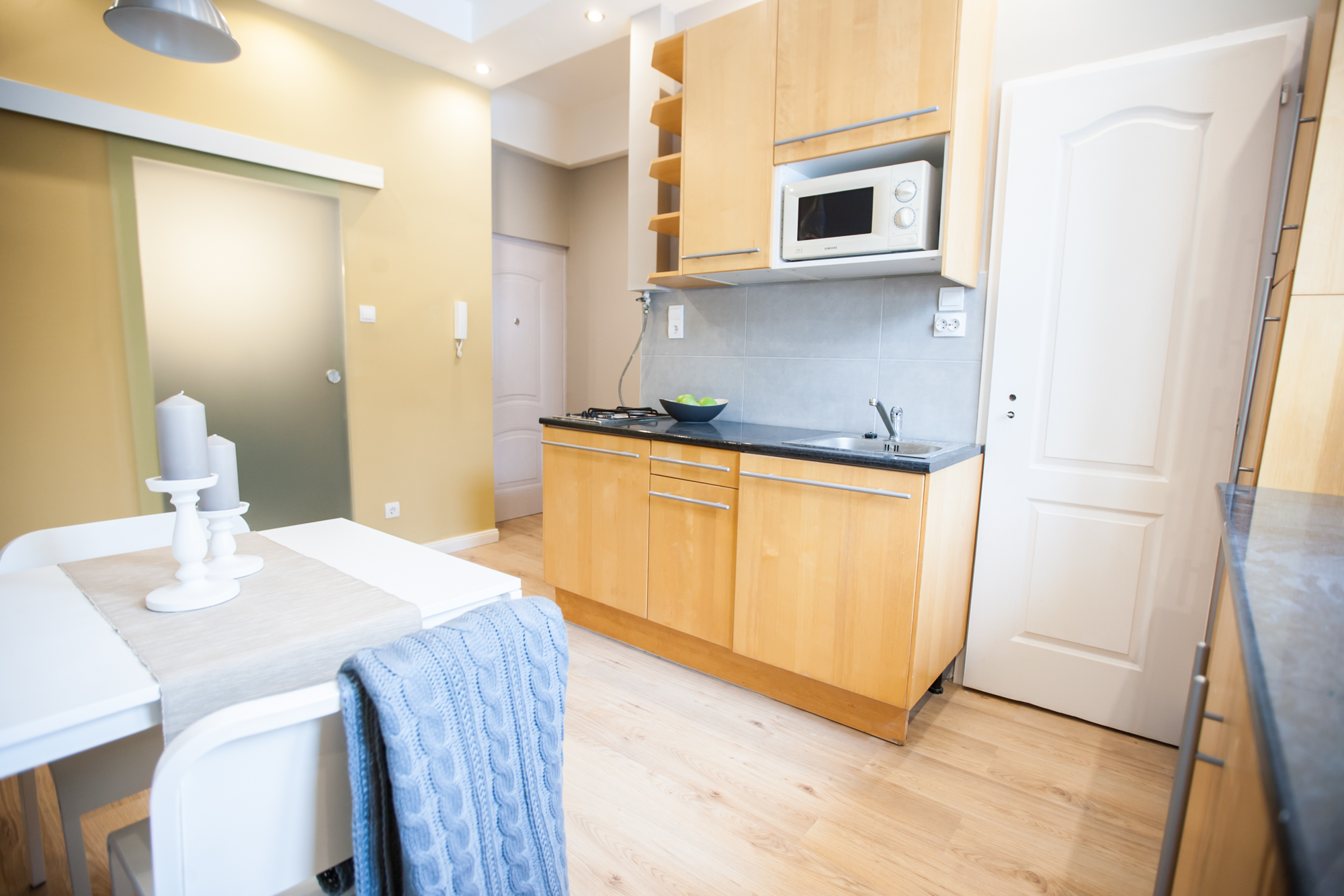 szekrénysor, mosogató, tűzhely, étkészlet, poharak, bögrék, evőeszközök, edények, hűtő, mikrohullámú sütő