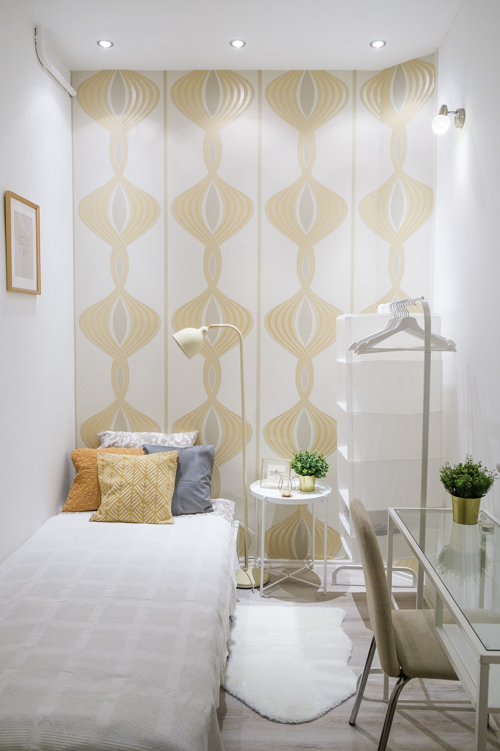 double bed, bedside table, wardrobe, study desk, chair, sheets, duvet, pillows