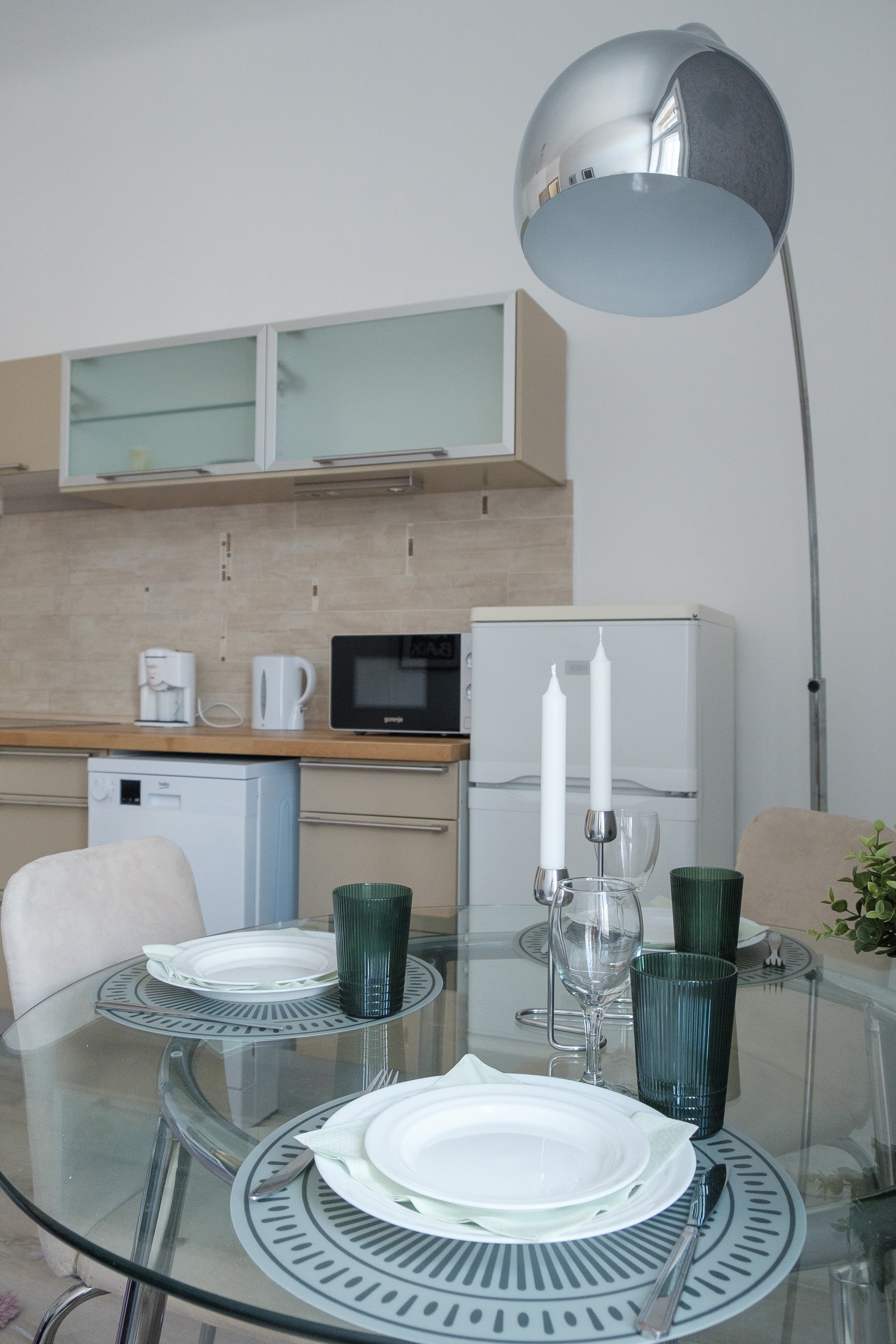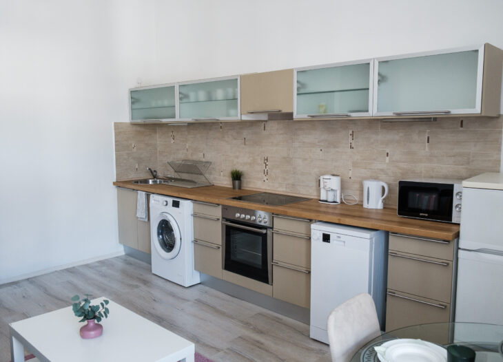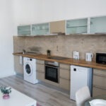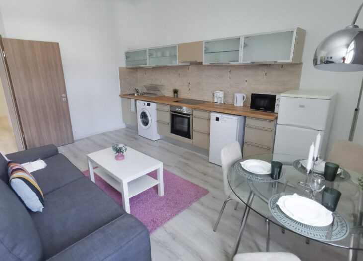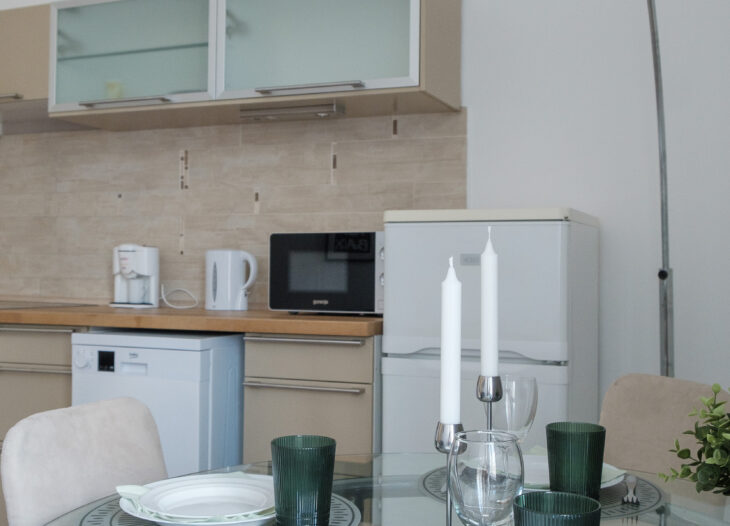 KITCHEN- DINING ROOM (fully equipped kitchen – fridge, oven, hot plate, microwave oven, dishwasher, kettle, cooking set, plats, mugs, glasses, cutlery, dining table, chairs, sofa, coffee table)