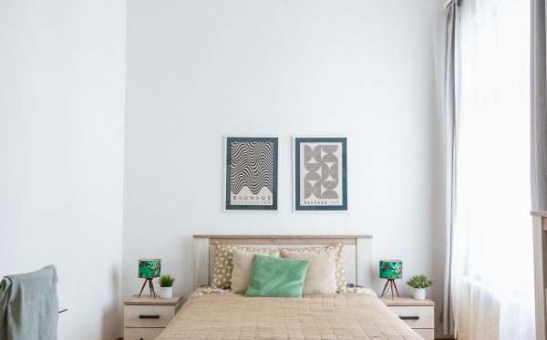 FLAT SIZE: 70 m2 ROOM 1 – Green forest – BOOKED 10 m2 double bed, desk, chair, wardrobe, sheets, duvet, pillows